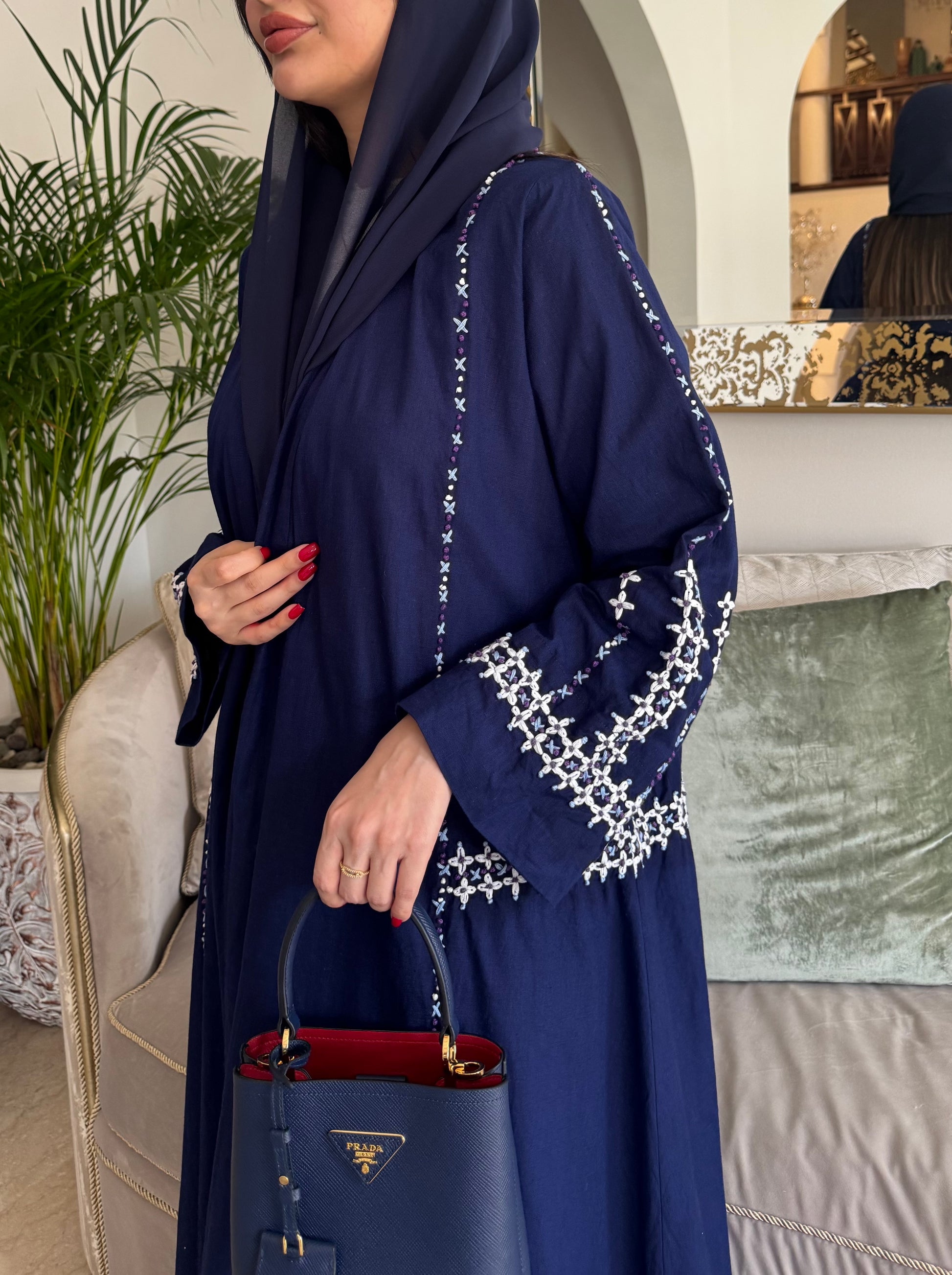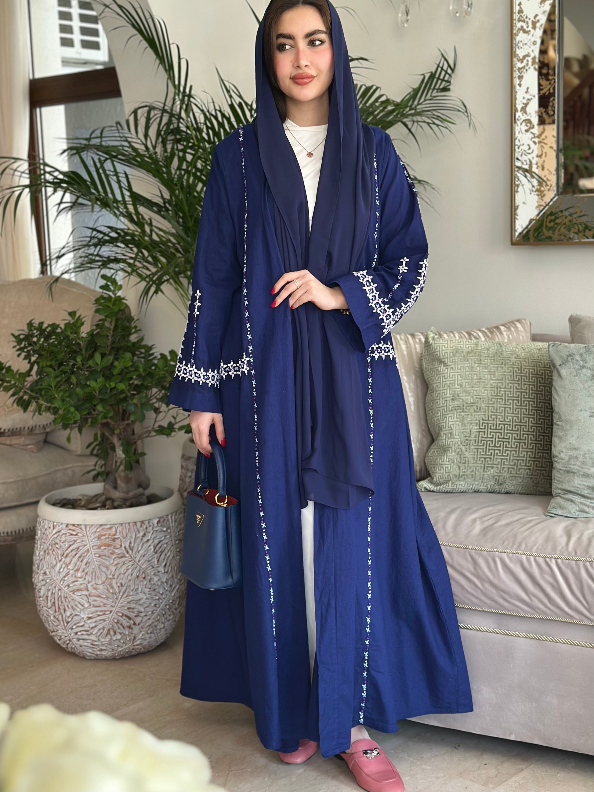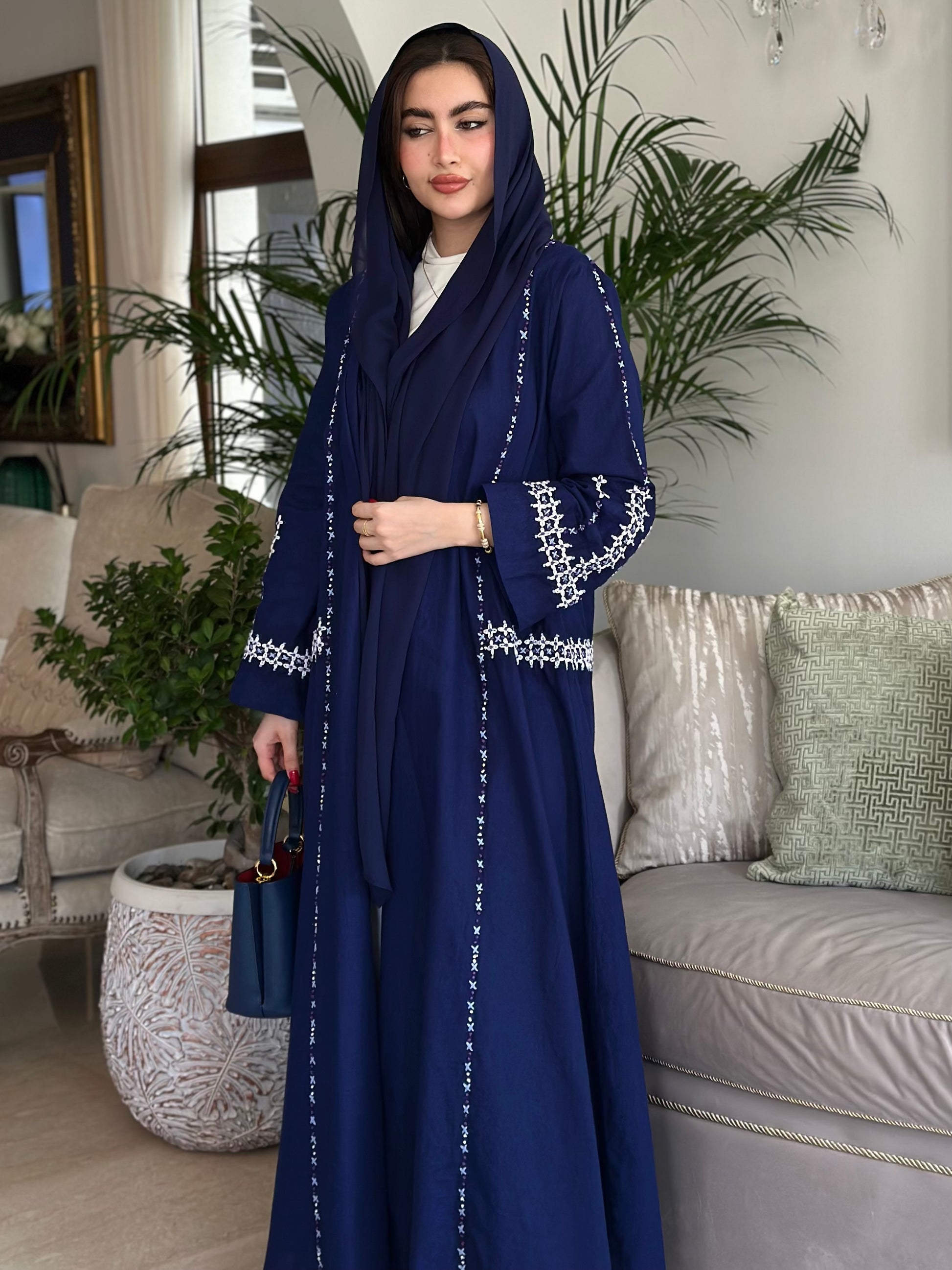 A-Cut Deep Ink Blue Abaya with handmade lattice geometric embroidery