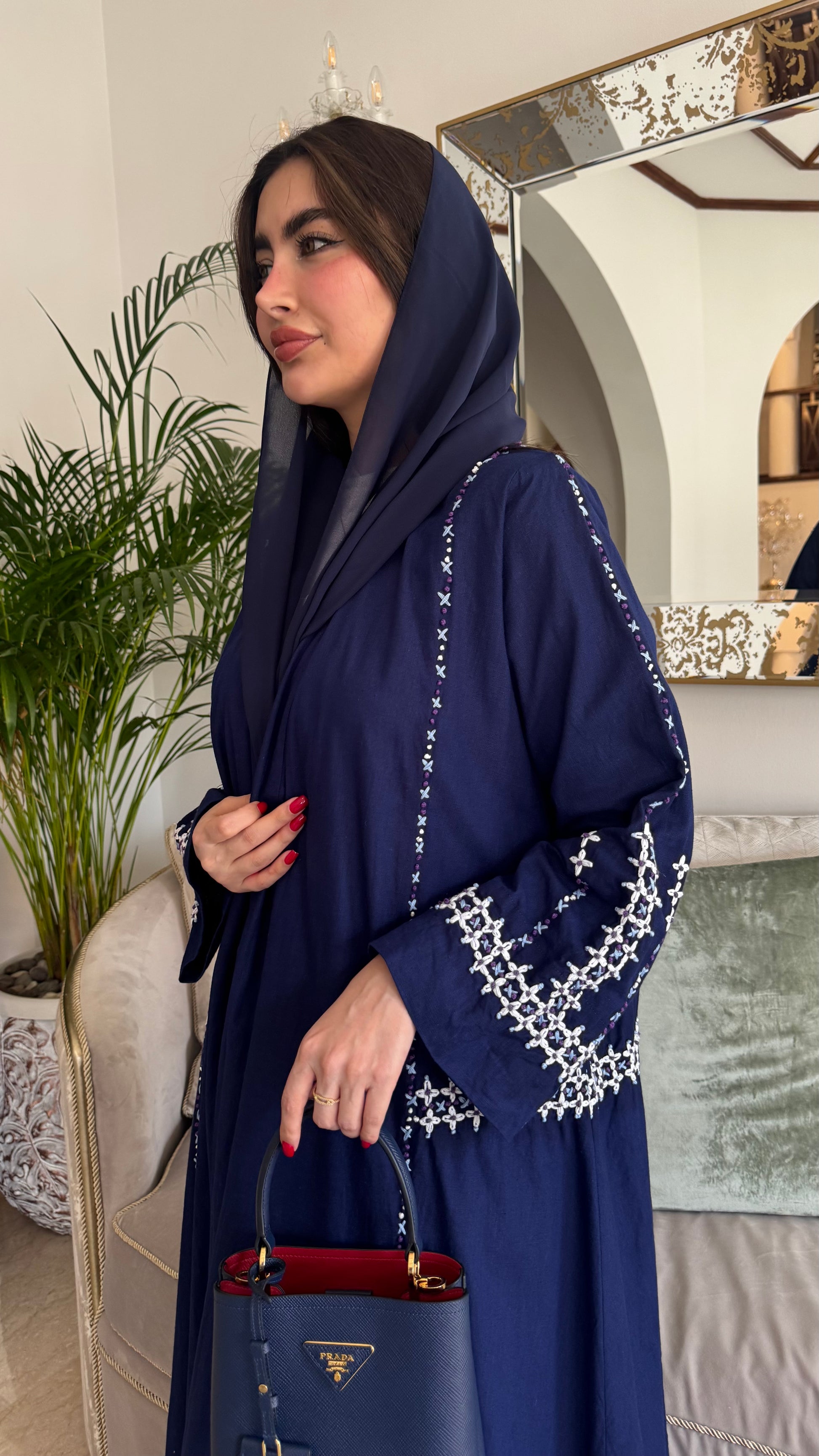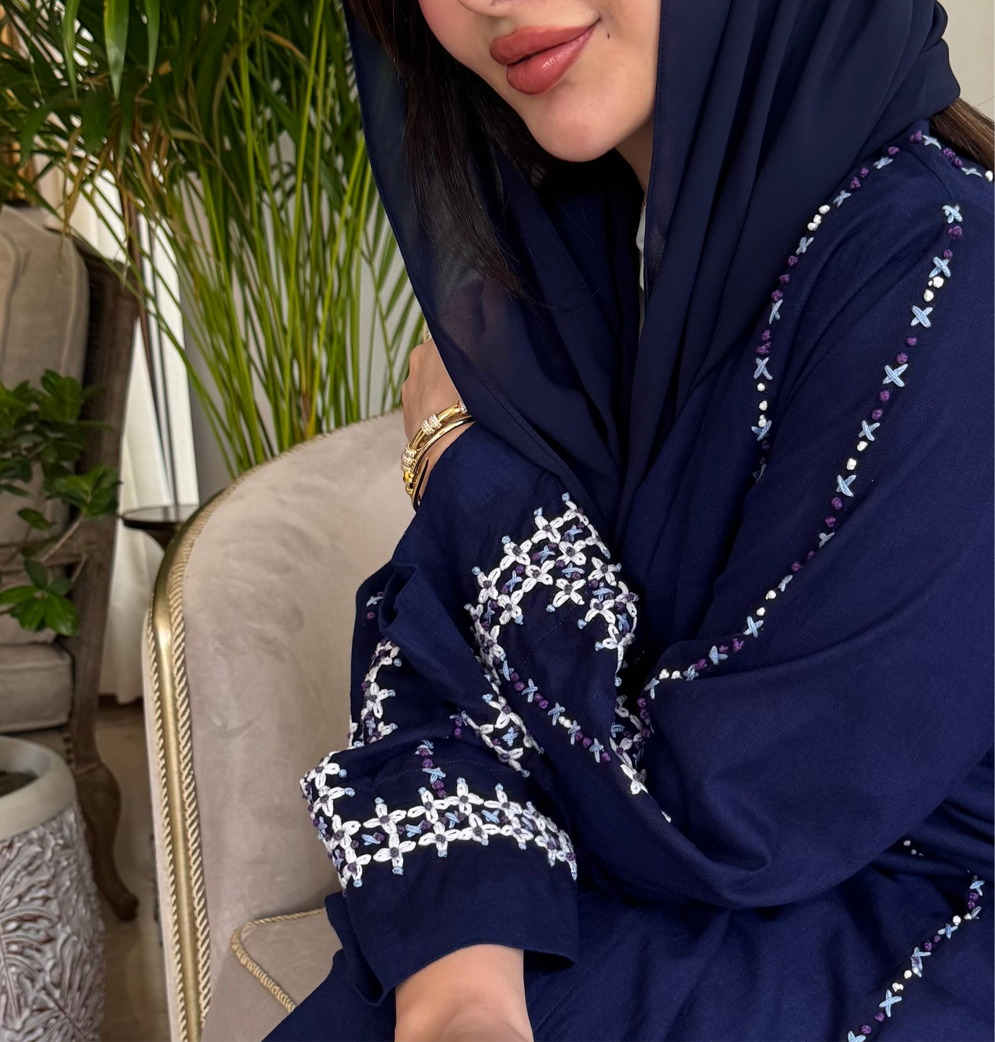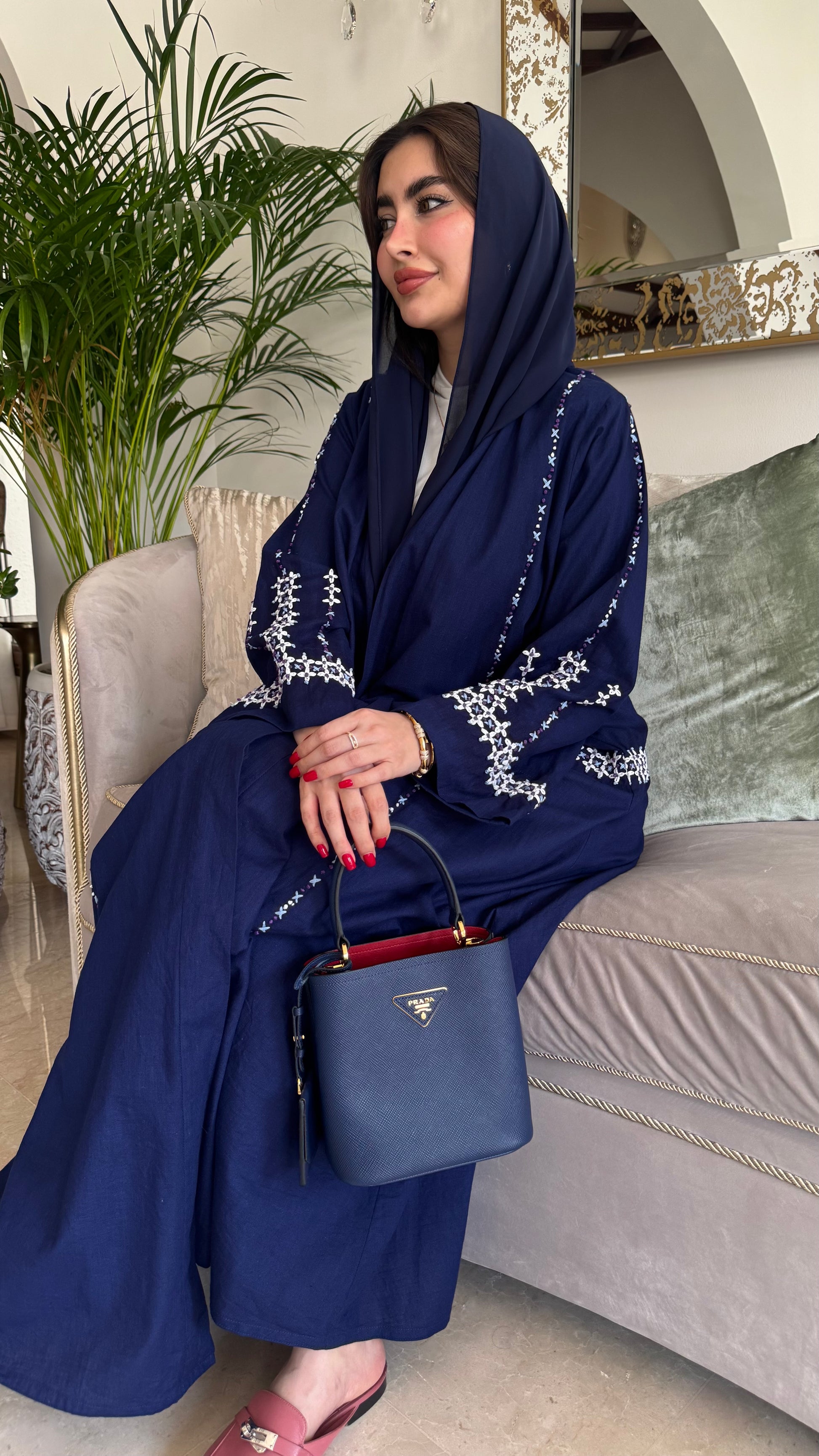 A-Cut Deep Ink Blue Abaya with handmade lattice geometric embroidery