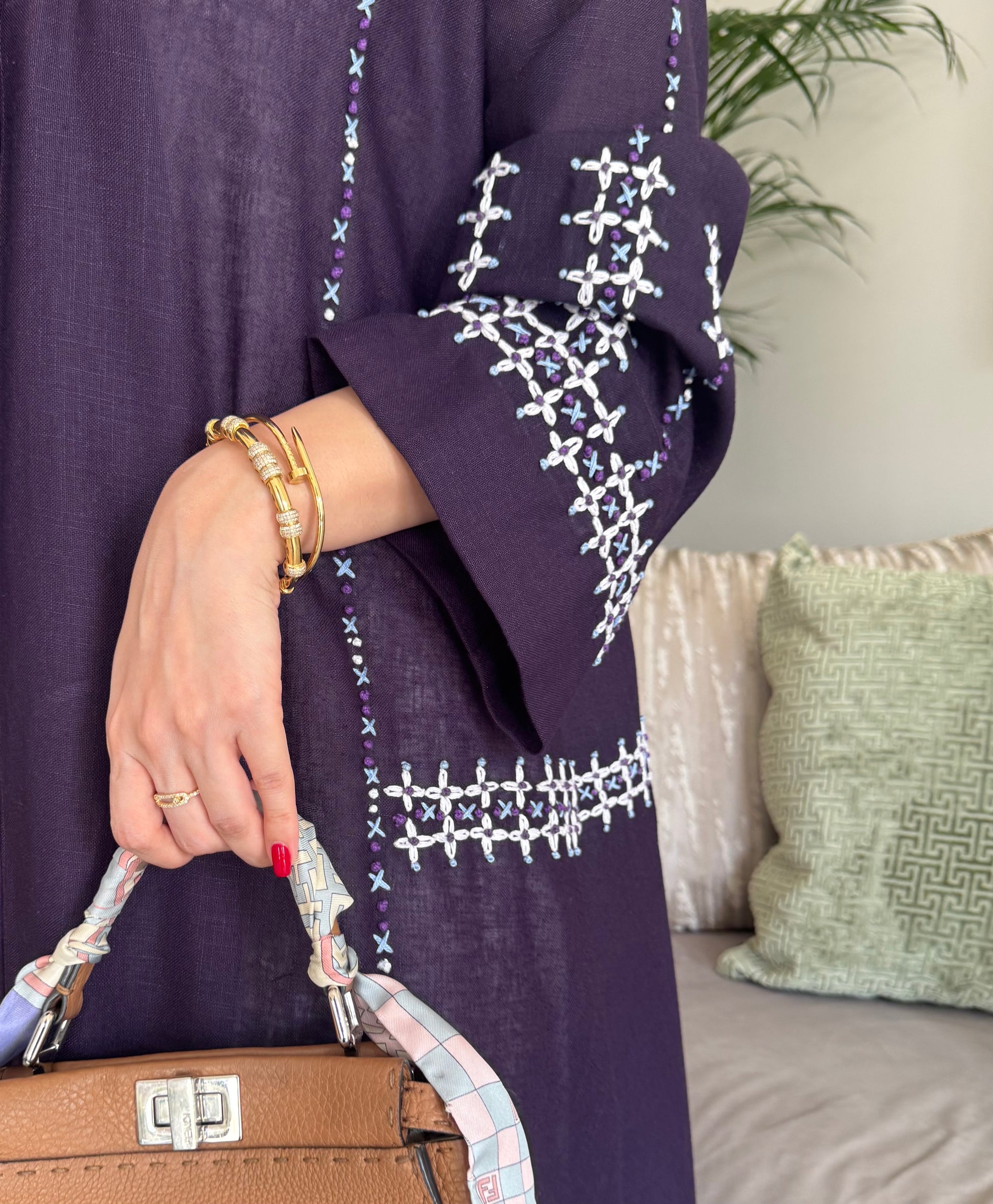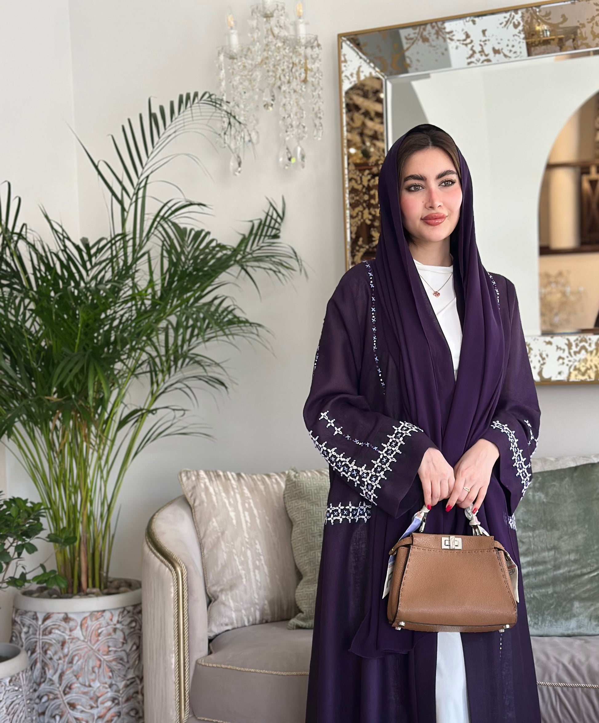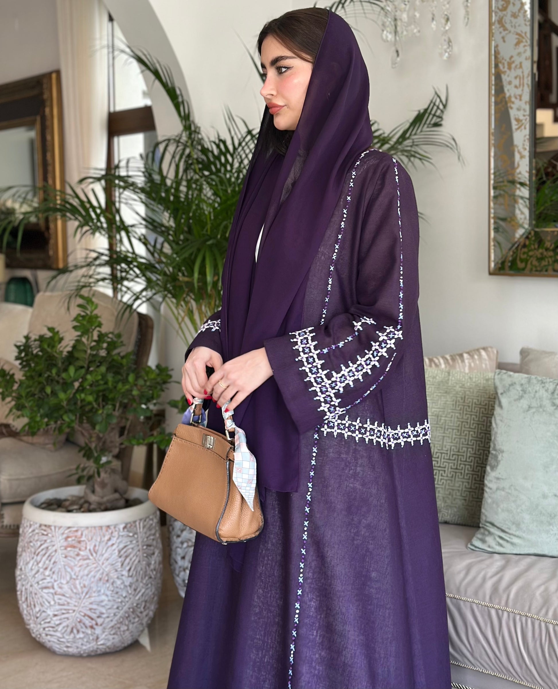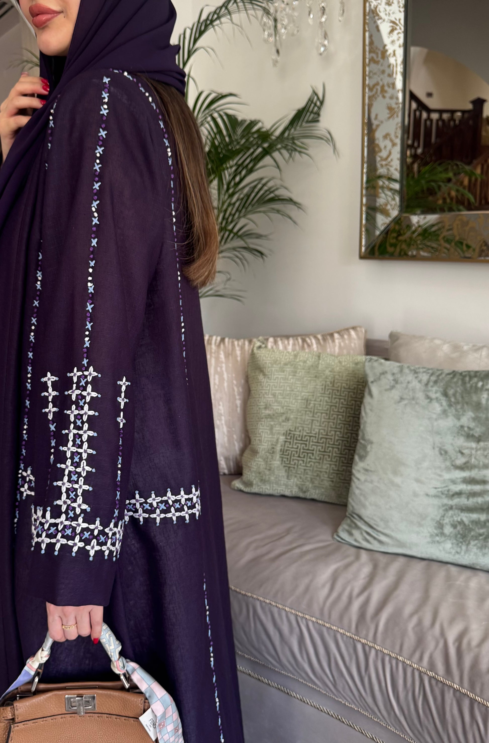 A-Cut Deep Purple Abaya with handmade lattice geometric embroidery